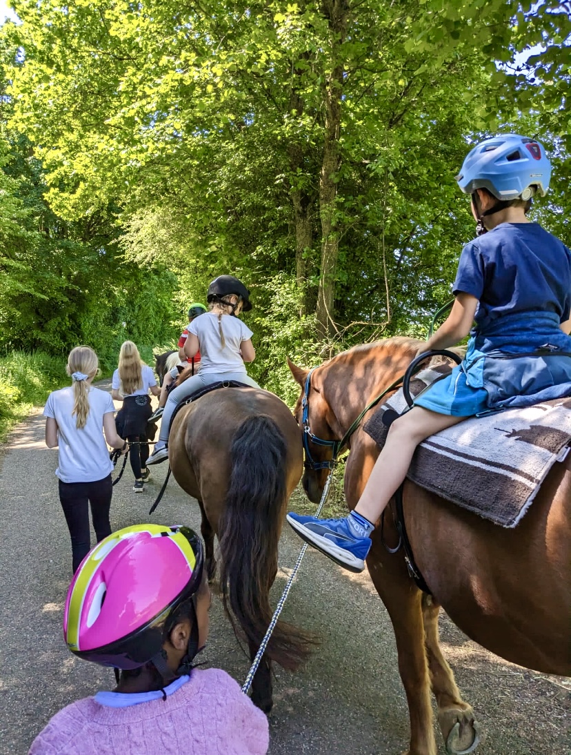 Die Kinder dürfen an der Longe in allen drei Grundgangarten reiten. Oder wir unternehmen wir allen Pferden einen Ausflug ins Grüne und genießen den Ausritt!